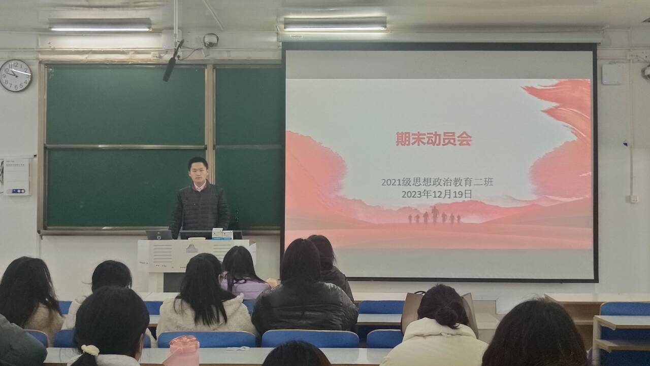 12月19日下午,ok138cn太阳集团5292021级思想政治教育二班在社科楼514教室召开期末动员会。2021级思想政治教育二班全体成员参加本次班会。班会由副班长任振豪主持。