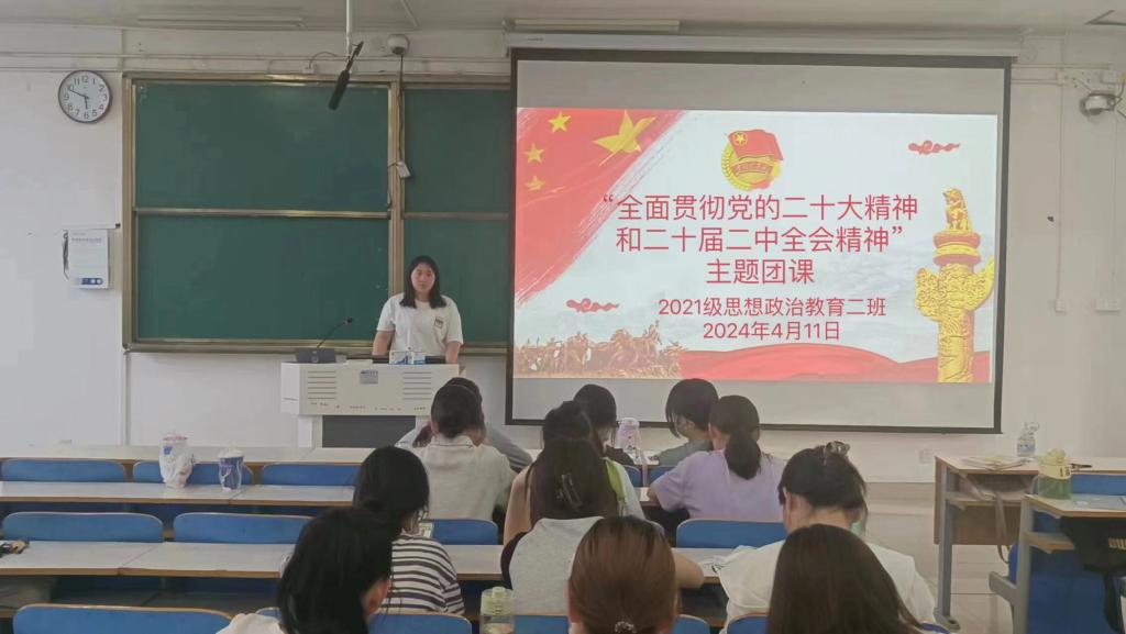 4月11日下午,ok138cn太阳集团5292021级思想政治教育二班在社科楼514教室召开“全面贯彻党的二十大精神和二十届二中全会精神”主题团课。2021级思想政治教育二班全体团员参加此次团课。团课由团支书王婧欣主持。