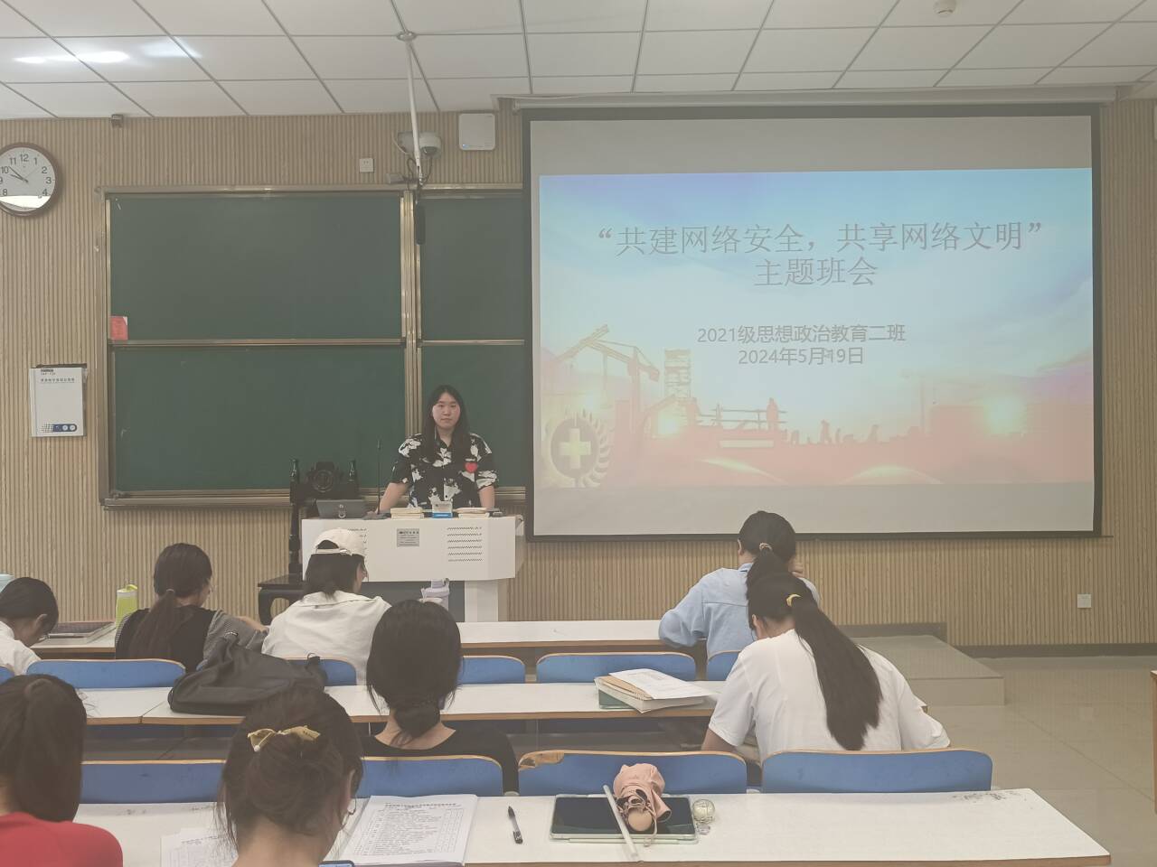 5月19日下午,ok138cn太阳集团5292021级思想政治教育二班在社科楼514教室召开“共建网络安全,共享网络文明”主题班会。2021级思想政治教育二班全体同学参加此次班会。班会由团支书王婧欣主持。