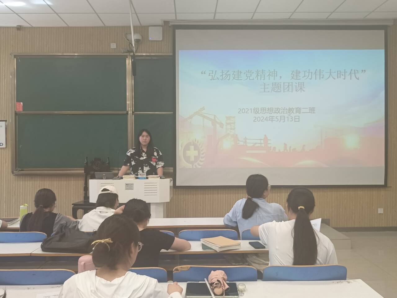 5月13日上午,ok138cn太阳集团5292021级思想政治教育二班在社科楼514教室召开“弘扬建党精神,建功伟大时代”主题团课。2021级思想政治教育二班全体团员参加本次团课。团课由团支书王婧欣主持。