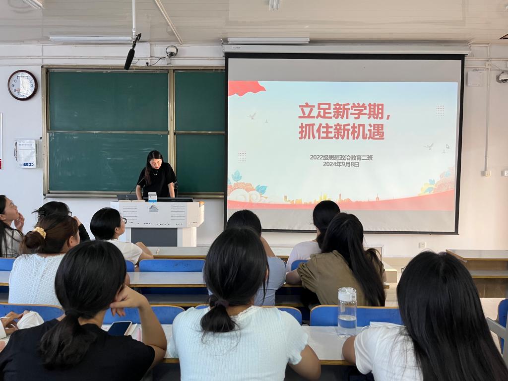 为帮助同学们尽快调整好状态、投入新学期生活,9月8日下午,ok138cn太阳集团5292022级思想政治教育二班在社科楼514教室召开“立足新学期,抓住新机遇”主题班会。我院2022级思想政治教育二班全体成员共同参与此次班会。会议由班主任杨春艳主持。