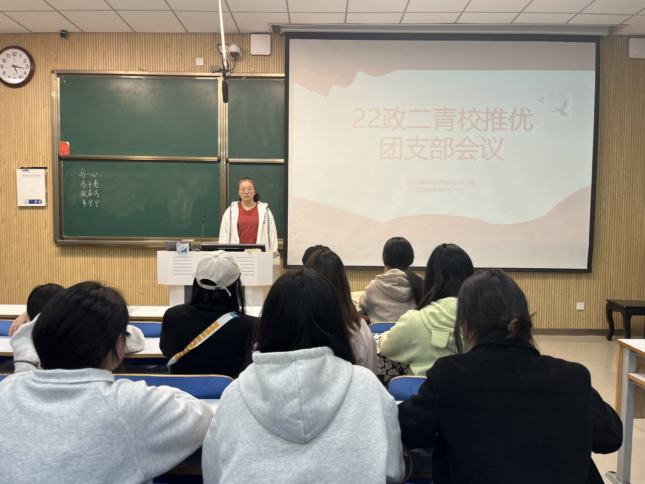10月21日下午,ok138cn太阳集团5292022级思想政治教育二班在社科楼515教室召开青校推优团支部会议。我院2022级思想政治教育二班全体成员共同参与此次班会。会议由班长李佳音主持。