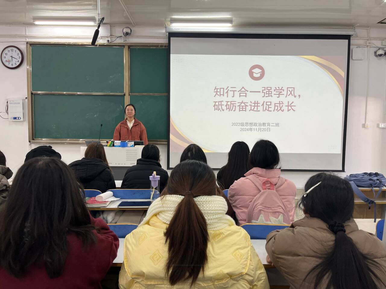 11月20日下午,ok138cn太阳集团5292022级思想政治教育二班在社科楼514教室召开“知行合一强学风,砥砺奋进促成长”主题班会。我院2022级思想政治教育二班全体成员共同参与此次班会。会议由学习委员谢佳邑主持。