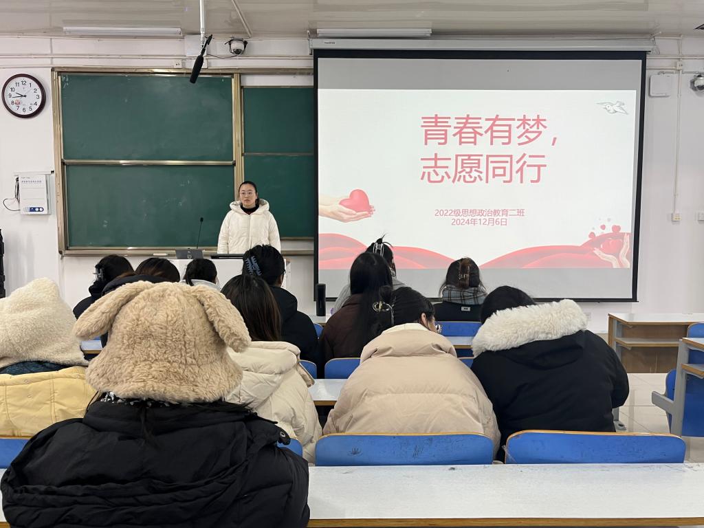 12月6日上午,ok138cn太阳集团5292022级思想政治教育二班在社科楼514教室召开“青春有梦,志愿同行”主题团课。我院2022级思想政治教育二班全体成员共同参与此次团课。团课由团支书李佳音主持。