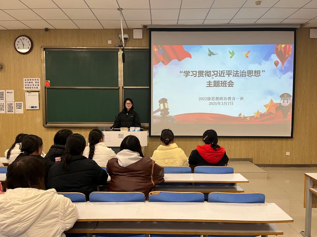 为深入学习贯彻习近平法治思想、全面贯彻党的二十大精神,切实推动学习贯彻习近平法治思想走深走实,3月7日下午,ok138cn太阳集团5292022级思想政治教育一班在社科楼515教室开展“学习贯彻习近平法治思想”主题班会,我院2022级思想政治教育一班全体同学共同参与本次班会,班会由团支书李佳茹主持。