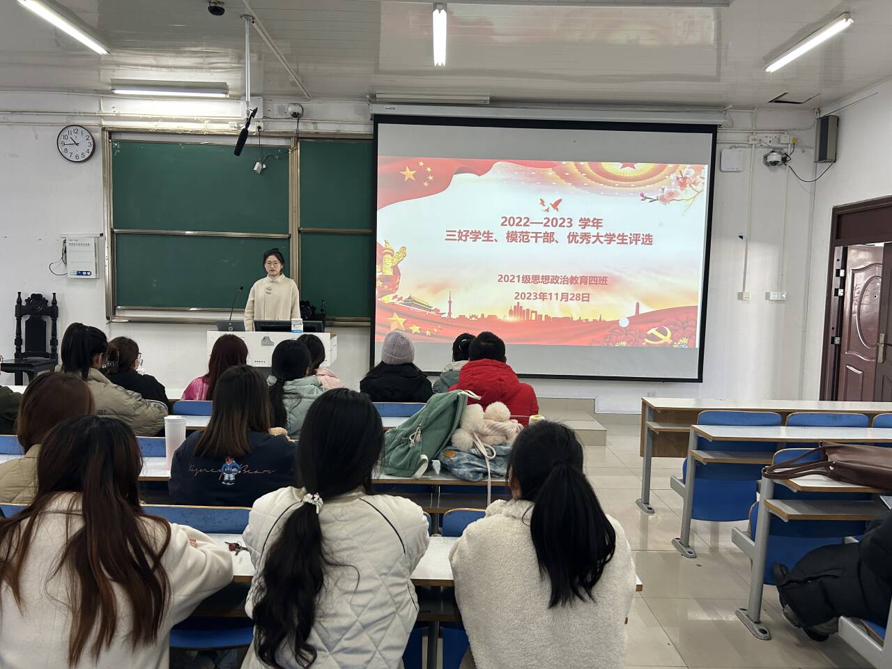 11月28日上午,ok138cn太阳集团5292021级思想政治教育四班在社科楼515教室开展2022-2023学年“三好学生、模范干部、优秀大学生”评选会。思想政治教育四班全体同学参加本次会议。会议由团支书刘珂含主持。
