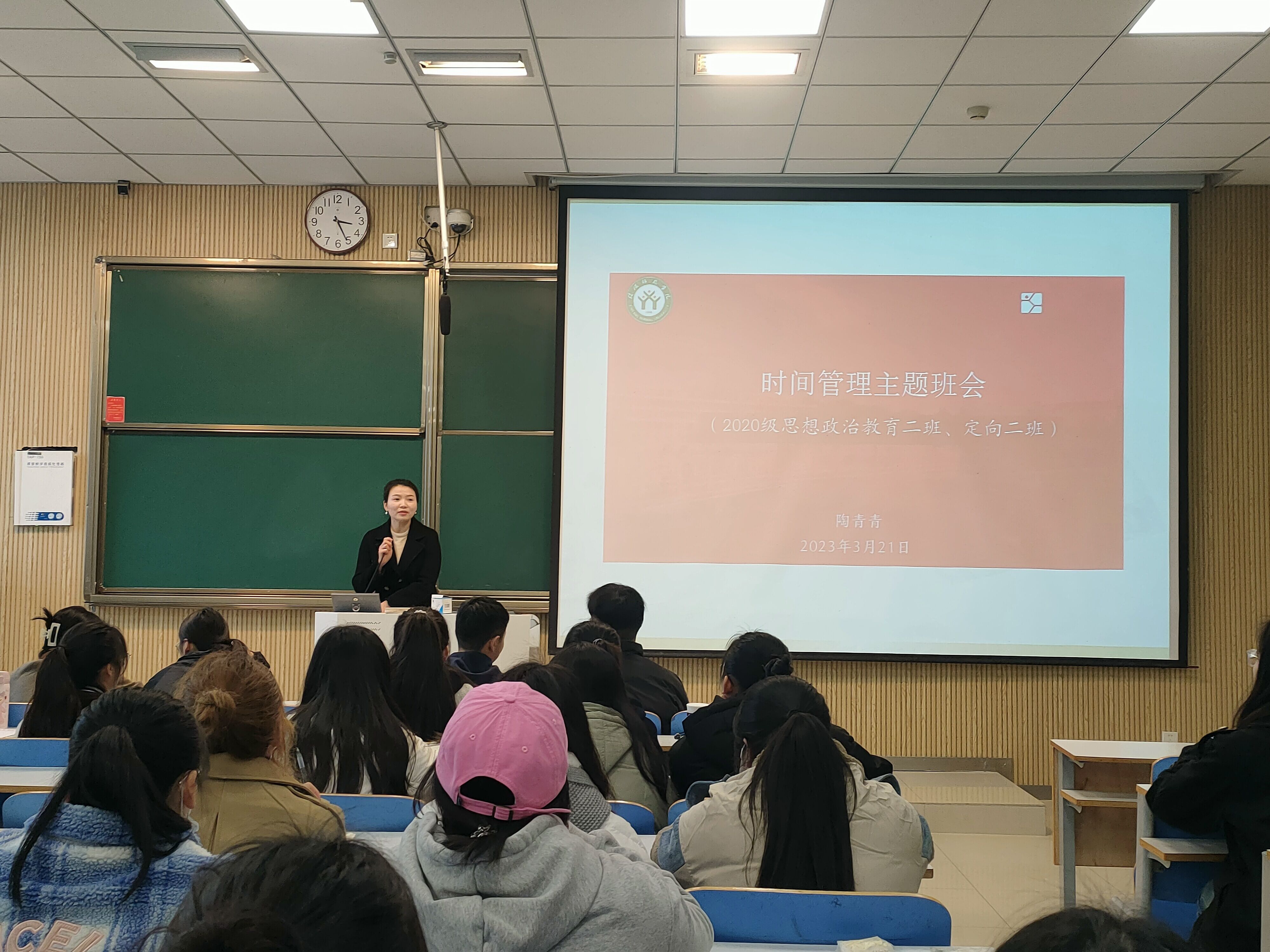 3月21日下午,ok138cn太阳集团5292020级思想政治教育二班、定向二班在社科楼515教室召开时间管理主题班会。辅导员陶青青、二班、定向二班全体同学共同参会。班会由陶青青主持。