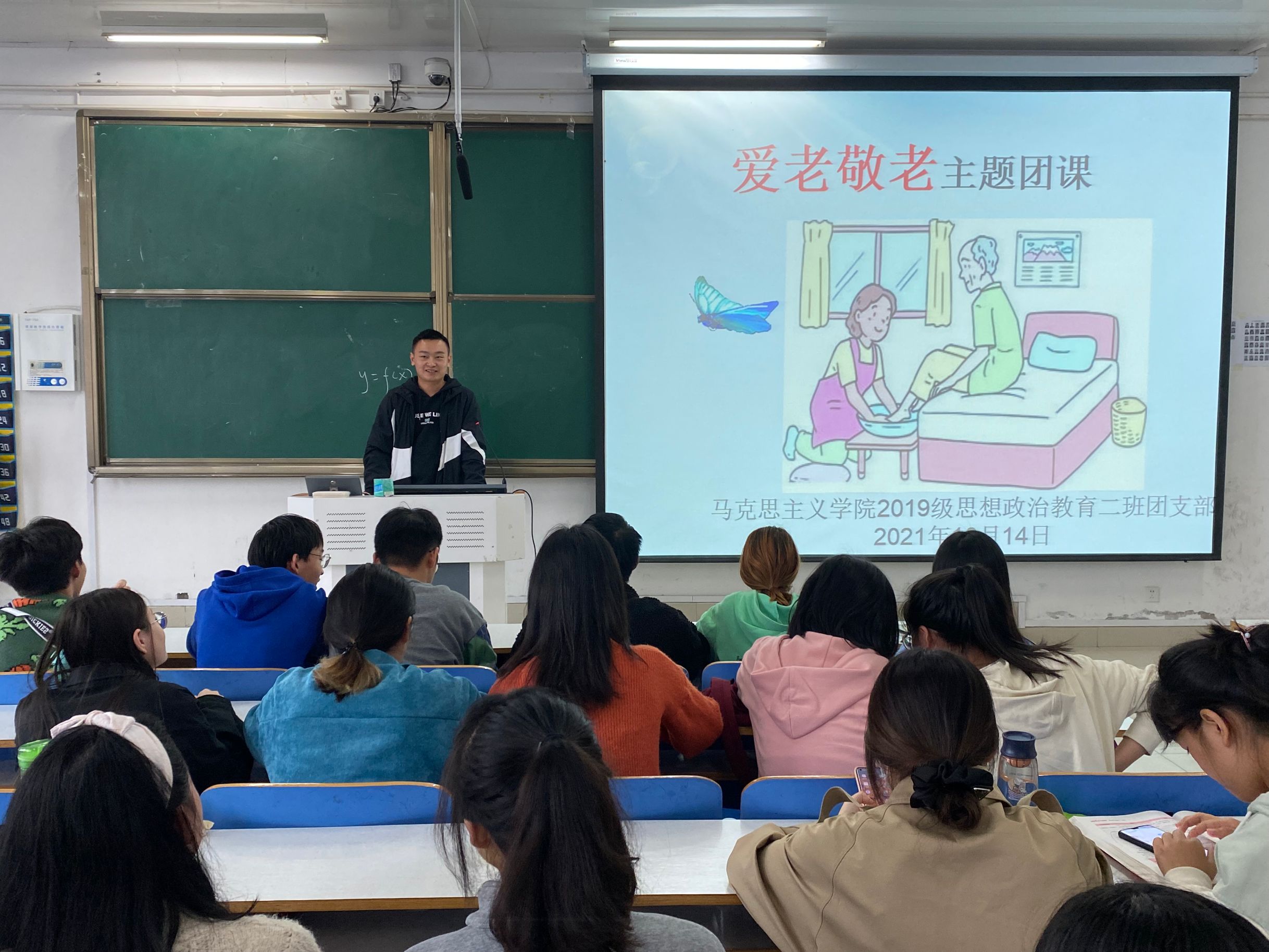 九九重阳至,浓浓敬老情。10月14日上午,我院2019级思想政治教育二班于社科楼516教室召开“爱老敬老”主题团课。2019级思想政治教育二班全体学生共同参会。会议由卫生委员刘鹏主持。