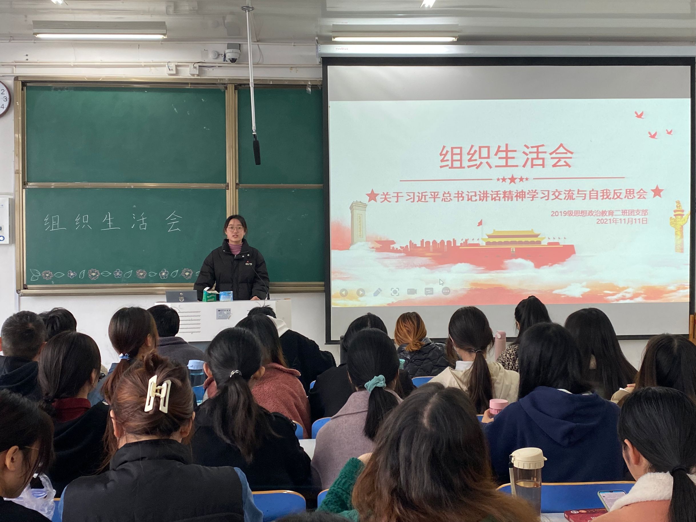 为贯彻落实全团“学党史、强信念、跟党走”学习教育部署,强化广大团员的使命担当,11月11日上午,我院2019级思想政治教育二班于社科楼516教室召开关于习近平总书记讲话精神学习交流与自我反思专题组织生活会。2019级思想政治教育二班辅导员陶青青以及全体学生共同参会。会议由团支书孙雅娴主持。
