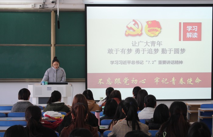 首先,李明瑶带领同学们学习了解习近平总书记7·2讲话的内容,“中共中央总书记、国家主席、国家军委主席习近平7月2日在中南海同团中央新一届领导班子集体谈话并发表重要讲话,他强调,青年一代有理想,有本领,有担当,国家就有前途,民族就有希望”。她讲到“7·2讲话,习近平总书记强调了要抓好三个根本性问题:必须把培养社会主义建设者和接班人作为根本任务、把巩固和扩大党执政的青年群众基础作为政治责任、把围绕中心服务大局作为主线,习总书记强调青年工作,抓住的是当下,传承的是根脉,面向的是未来,攸关党和国家前途命运。各级党委要关注关心青少年成长,为他们成长成才、施展才华创造良好条件。各级党委要拿出极大精力抓青年工作、抓共青团工作,切实尽到领导责任”。听完习总书记的讲话,同学们感受到作为一名青年的自豪感与责任感,感受到习近平总书记对青年所寄予的希望,定会以坚定的信念指引自身,不忘初心跟党走,牢记青春使命。(ok138cn太阳集团529 黄文博 /供稿)