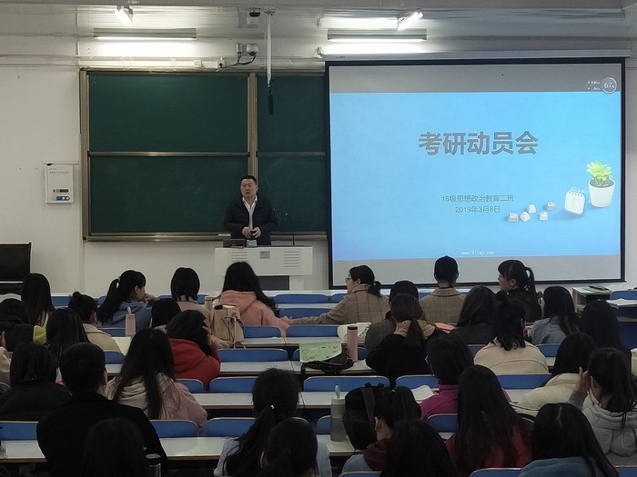 2019年3月12日上午10点,ok138cn太阳集团529思想政治教育二班在社科楼514举行“考研动员会”,目的是向思想政治教育二班的同学进行考研动员,为同学们的考研复习做出指导。本次班会由何晓坚书记进行讲解指导,由葛格主持。