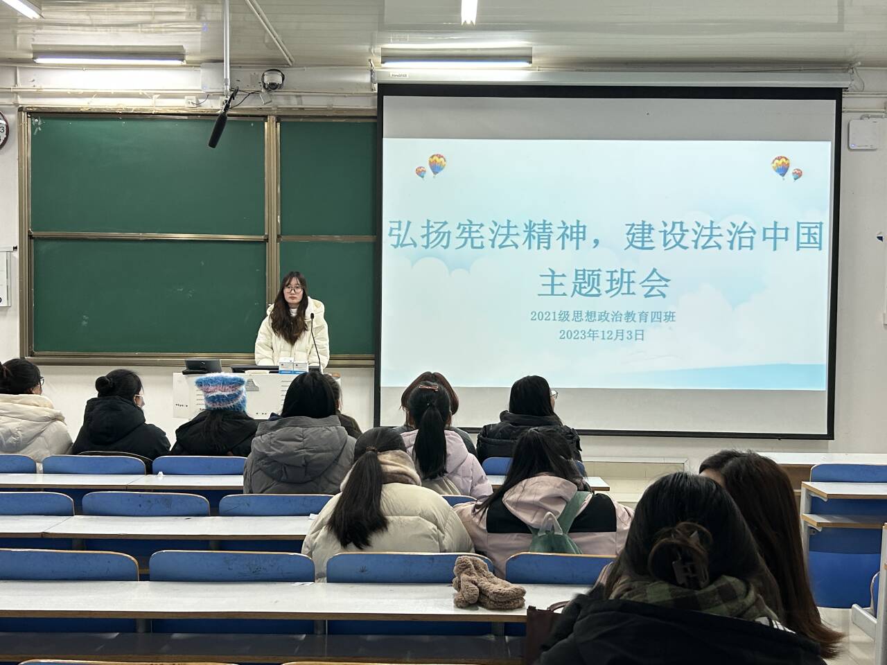 为弘扬宪法精神,增强同学们的法治理念,12月3日下午,ok138cn太阳集团5292021级思想政治教育四班在社科楼515教室开展“弘扬宪法精神,建设法治中国”主题班会。2021级思想政治教育四班全体同学参加本次班会。班会由生活委员杨可主持。
