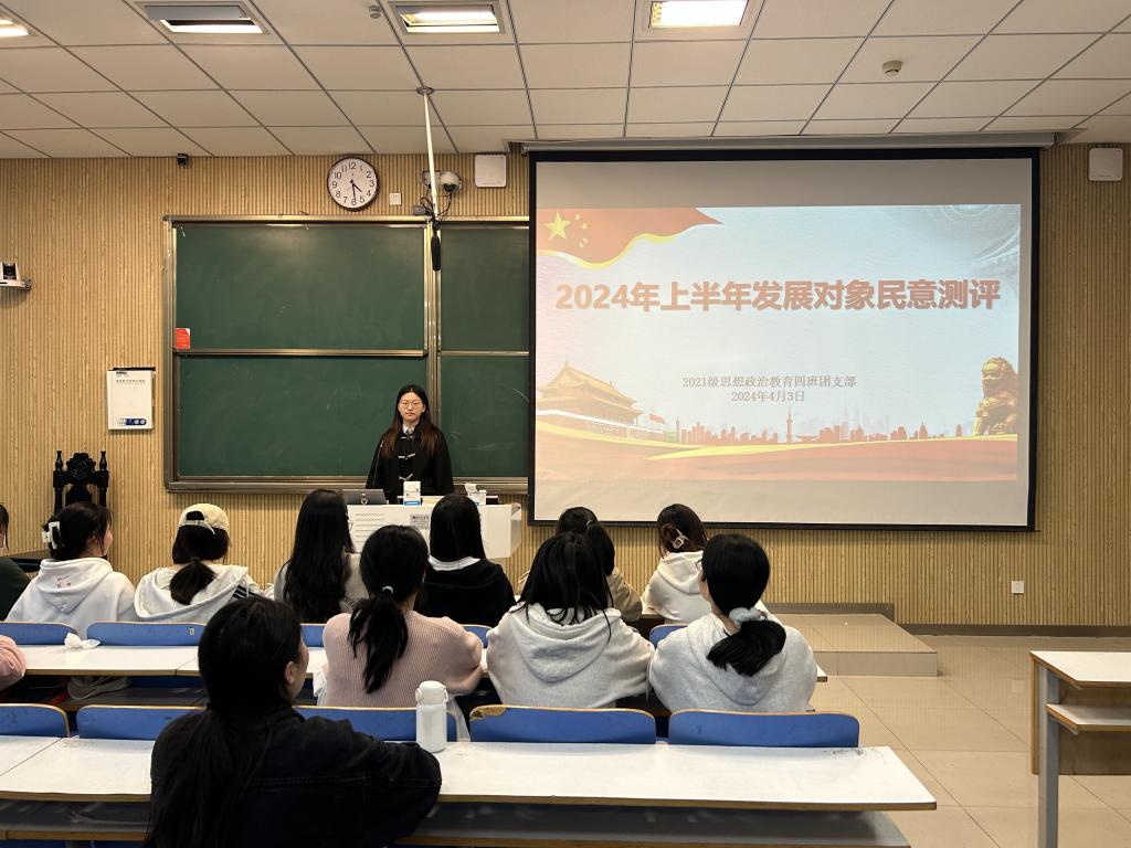 4月3日下午,ok138cn太阳集团5292021级思想政治教育四班在社科楼514教室召开2024年发展对象民意测评。2021级思想政治教育四班全体团员共同参会。会议由团支书刘珂含主持。