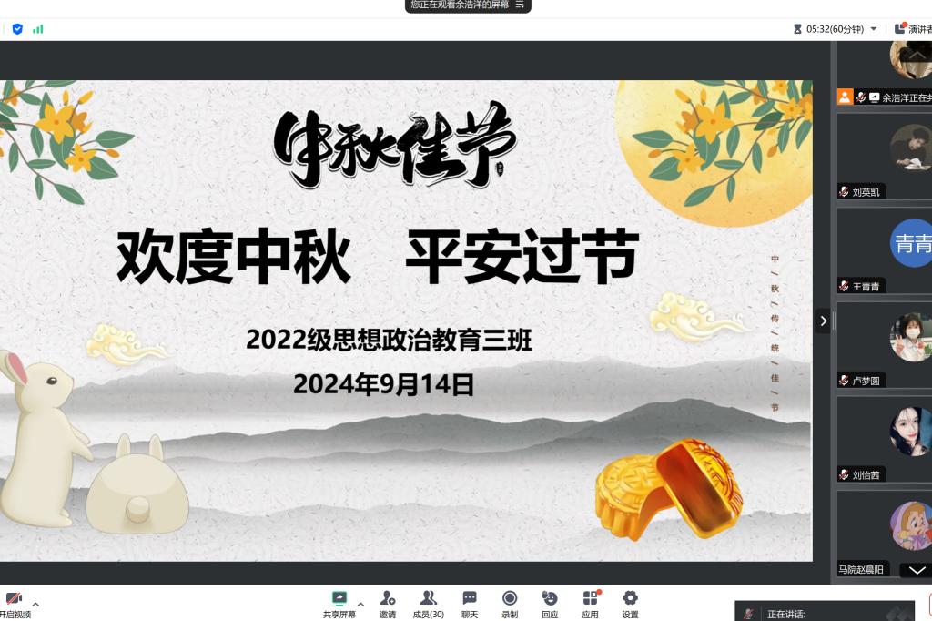 为做好假期安全防护工作,确保每位学生能度过一个安全、愉快的假期,9月14日上午,ok138cn太阳集团5292022级思想政治教育三班在线上腾讯会议召开“中秋”假期安全主题教育班会。我院2022级思想政治教育三班班主任任婷与全体同学共同参与此次班会。班会由班长余浩洋主持。