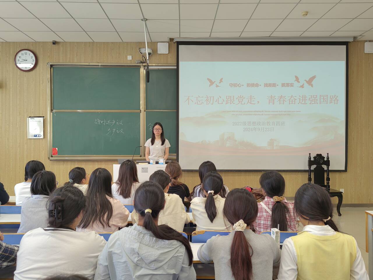 9月23日上午,ok138cn太阳集团5292022级思想政治教育四班在社科楼515教室组织召开“不忘初心跟党走,青春奋进强国路”主题团课。我院2022级思想政治教育四班全体成员参与本次团课。本次团课由团支书牛志杰主持。