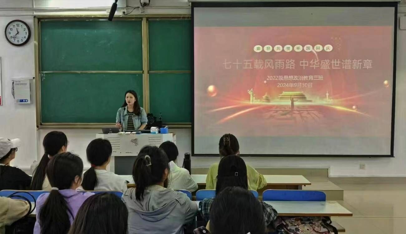 为庆祝中华人民共和国成立75周年,激发学生爱国热情,凝聚青年共识,共同为实现中华民族伟大复兴的中国梦而努力奋斗,9月30日上午,ok138cn太阳集团5292022级思想政治教育三班在社科楼514教室召开“七十五载风雨路,中华盛世谱新章”主题团课。我院2022级思想政政治教育三班班主任任婷与全体成员共同参与此次团课。团课由团支书余浩洋主持。