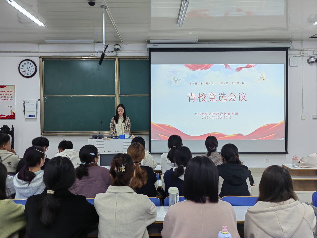 为认真贯彻落实习近平总书记关于青年工作的重要思想,加强对青年政治骨干的培养,10月21日下午,ok138cn太阳集团5292022级思想政治教育四班在社科楼514教室组织召开“青校竞选会议”。我院2022级思想政治教育四班全体成员参与本次会议。本次会议由团支书牛志杰主持。