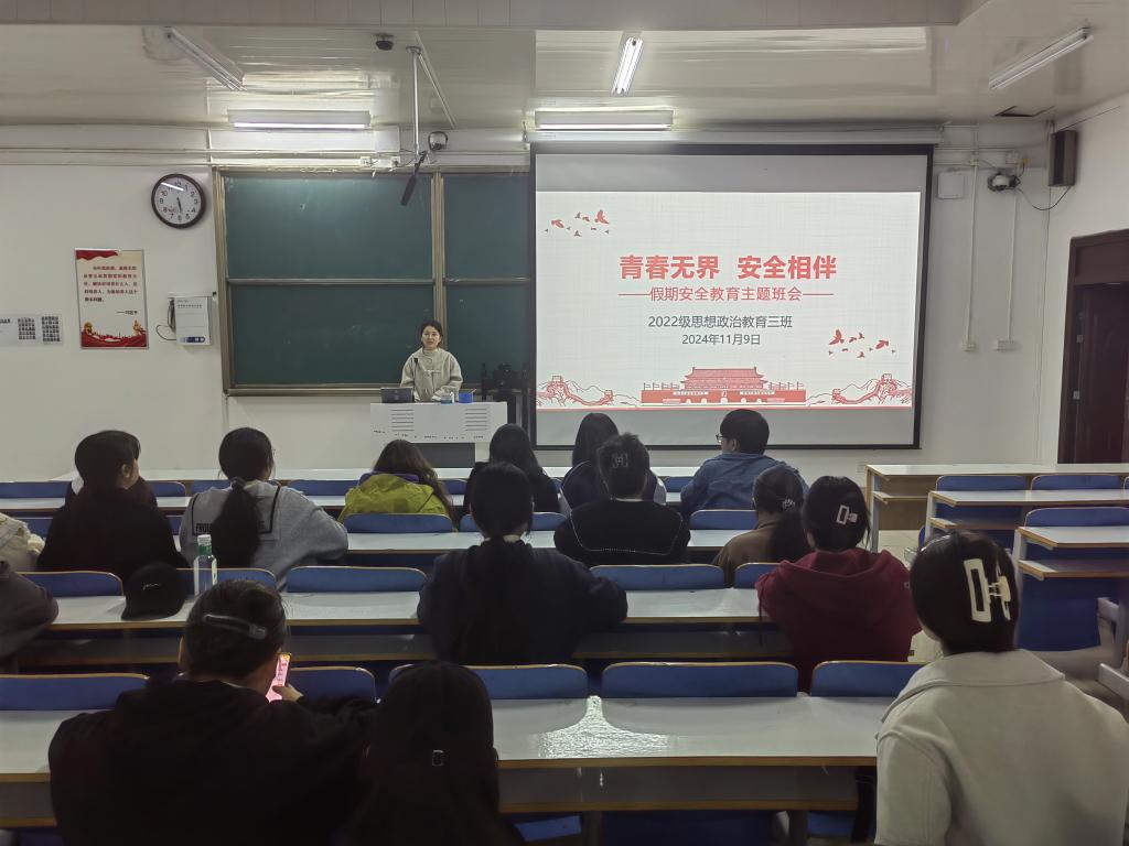 为进一步增强同学们的安全意识,提高防范意识,11月9日下午,ok138cn太阳集团5292022级思想政治教育三班在社科楼514教室召开“青春无界,安全相伴”安全教育主题班会。我院2022级思想政治教育三班班主任任婷和三班全体成员共同参与此次班会。班会由任婷主持。