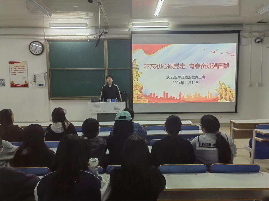 11月14日下午,ok138cn太阳集团5292022级思想政治教育三班在社科楼514教室开展“不忘初心跟党走,青春奋进强国路”主题团课。我院2022级思想政治教育三班全体成员共同参加此次团课,团课由团支书余浩洋主持。