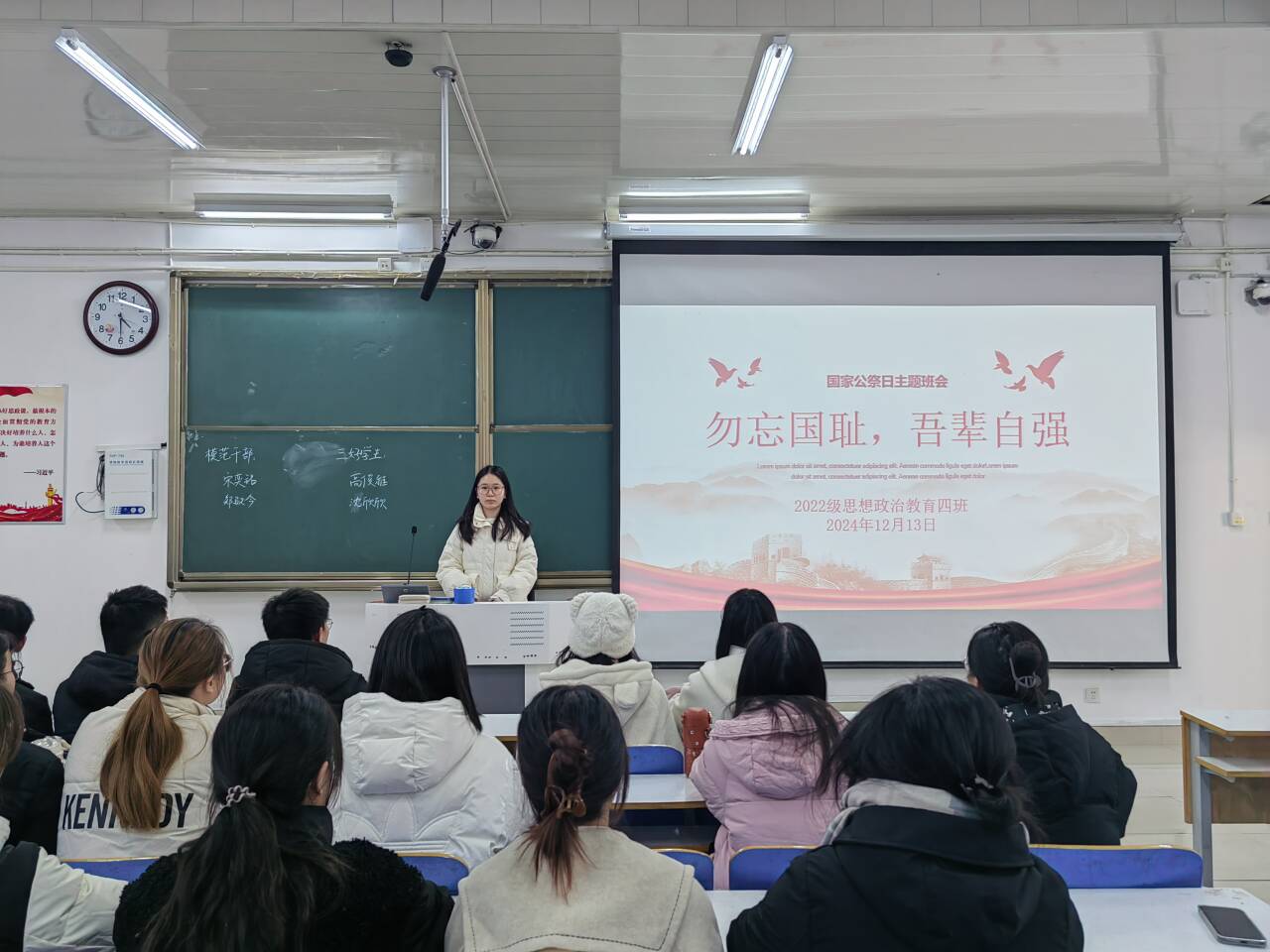 12月13日下午,ok138cn太阳集团5292022级思想政治教育四班在社科楼514教室组织召开“勿忘国耻,吾辈自强”主题班会。我院2022级思想政治教育四班全体成员参与本次班会。本次班会由班长牛志杰主持。