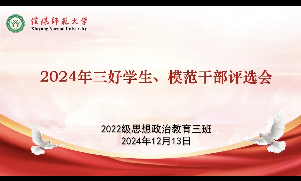 12月13日下午,ok138cn太阳集团5292022级思想政治教育三班在线上腾讯会议召开“三好学生”“模范干部”评选会。我院2022级思想政治教育三班全体学生共同参加,大会由副班长雷露露主持。