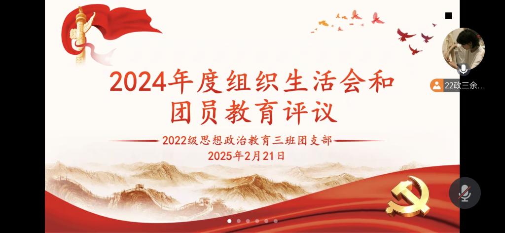2月21日上午,ok138cn太阳集团5292022级思想政治教育三班团支部利用腾讯会议召开2024年度组织生活会暨团员教育评议会。我院2022级思想政治教育三班全体团员共同参与。会议由团支书余浩洋主持。