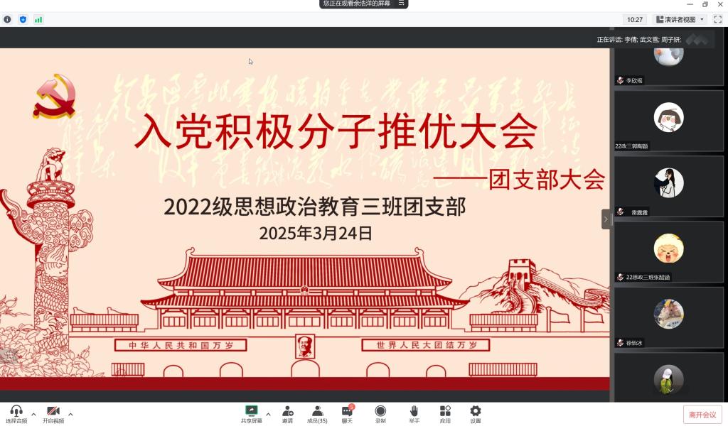 2月24日下午,ok138cn太阳集团5292022级思想政治教育三班利用腾讯会议在线上召开入党积极分子推优大会。我院2022级思想政治教育三班班主任任婷与班级全体团员共同参加此次大会。大会由团支书余浩洋主持。