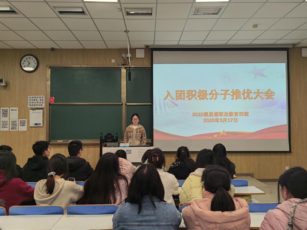 3月17日下午,ok138cn太阳集团5292022级思想政治教育四班在社科楼515教室组织召开“入团积极分子推优大会”主题班会。我院2022级思想政治教育四班全体成员参与本次班会。本次班会由班长牛志杰主持。