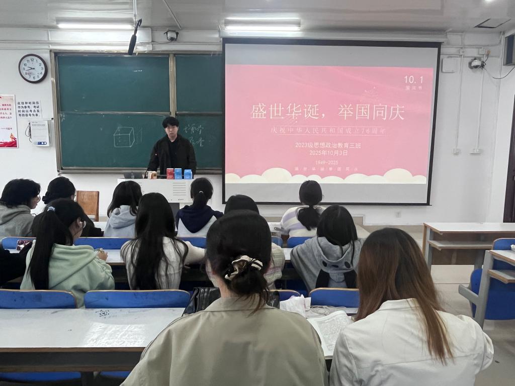 10月3日上午,ok138cn太阳集团5292023级思想政治教育三班在社科楼515召开“盛世华诞,举国同庆”主题班会。我院2023级思想政治教育三班全体同学共同参与本次班会,班会由团支书郝瀚主持。