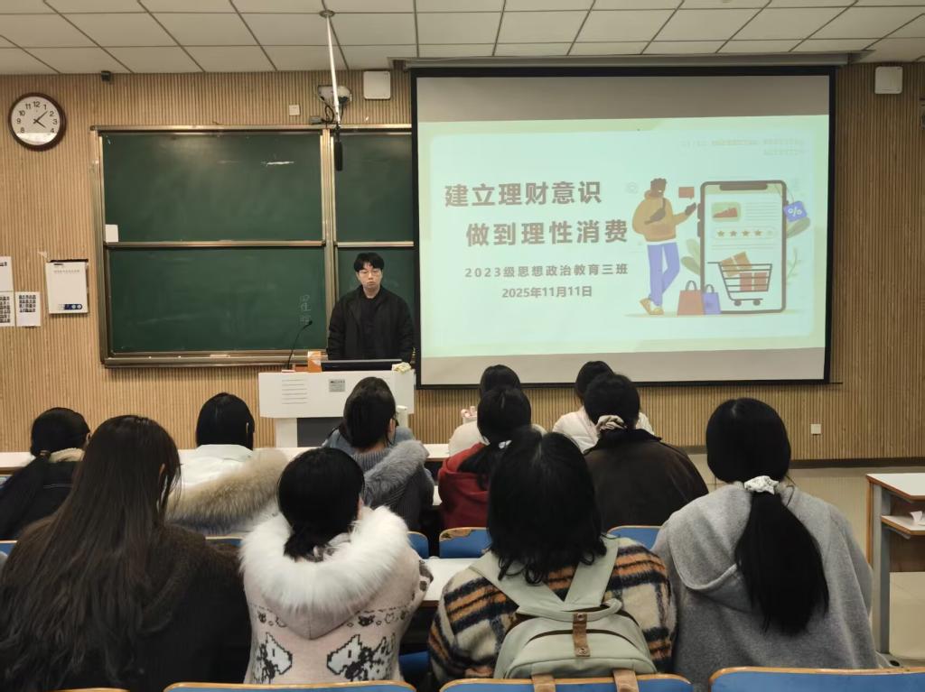 为帮助学生树立正确的消费观,11月11日上午,ok138cn太阳集团5292023级思想政治教育三班在社科楼515召开“理智消费,健康生活”主题班会。我院2023级思想政治教育三班全体同学共同参与本次班会,班会由团支书郝瀚主持。