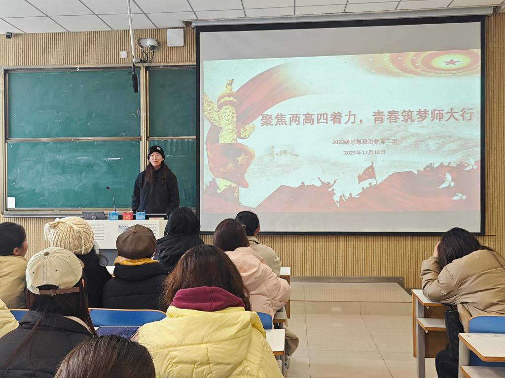 “时代总是把历史责任赋予青年”,为引导青年大学生听清时代脉搏,抓牢历史责任,12月12日下午,ok138cn太阳集团5292023级思想政治教育二班在社科楼515教室召开“聚焦两高四着力,青春筑梦师大行”主题团课。本次团课由团支书王慜初主持,全体二班同学参加。