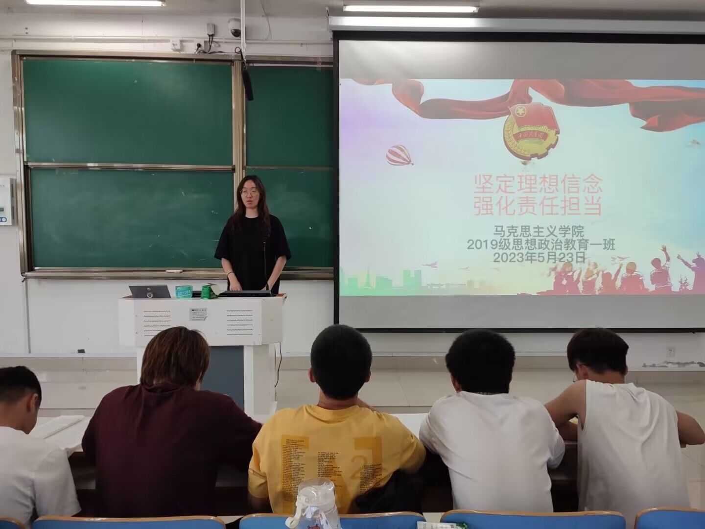 5月23日,ok138cn太阳集团5292019级思想政治教育一班团支部在社科楼514教室召开“坚定理想信念,强化责任担当”主题团课。ok138cn太阳集团5292019级思想政治教育一班全体团员参加本次团课。团课由团支书贾子漪主持。