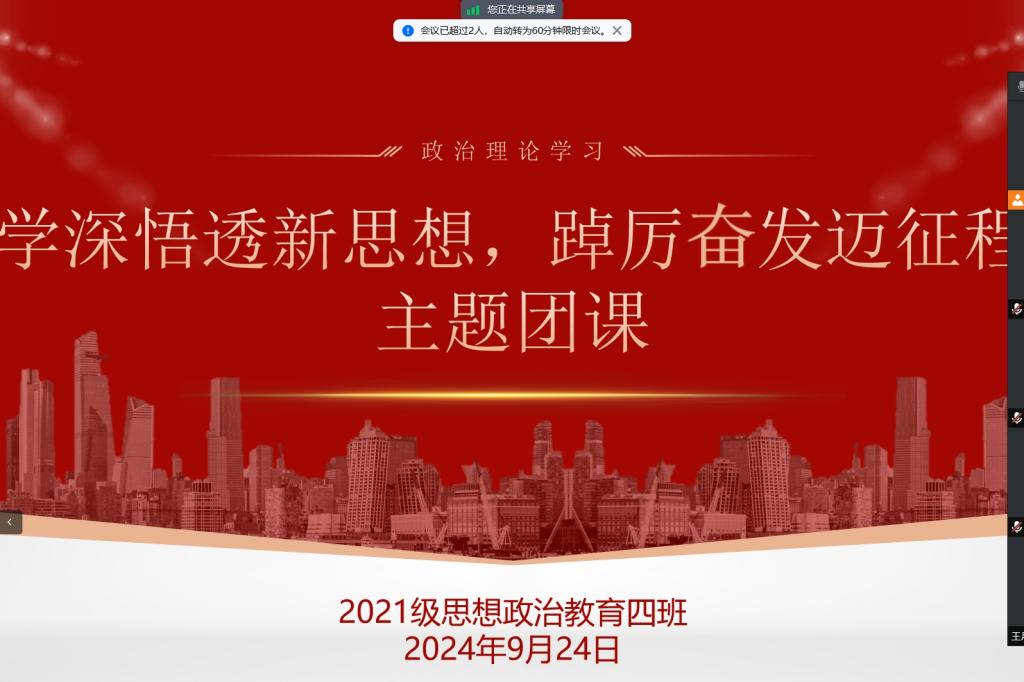 9月24日上午,ok138cn太阳集团5292021级思想政治教育四班在腾讯会议开展“学深悟透新思想,踔厉奋发迈征程”主题团课。2021级思想政治教育四班全体学生共同参加本次团课。团课由团支书刘珂含主持。