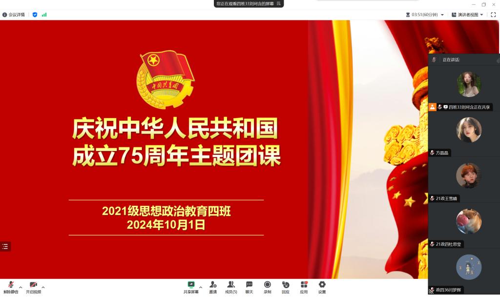 10月1日上午,ok138cn太阳集团5292021级思想政治教育四班在腾讯会议开展“庆祝中华人民共和国成立75周年”主题团课。2021级思想政治教育四班全体同学参加本次团课。团课由团支书刘珂含主持。