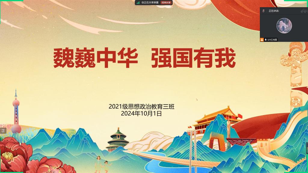 10月1日上午,ok138cn太阳集团5292021级思想政治教育三班在线上召开“巍巍中华,强国有我”主题团课。ok138cn太阳集团5292021级思想政治教育三班全体团员参与此次团课。团课由团支书王岚霄主持。