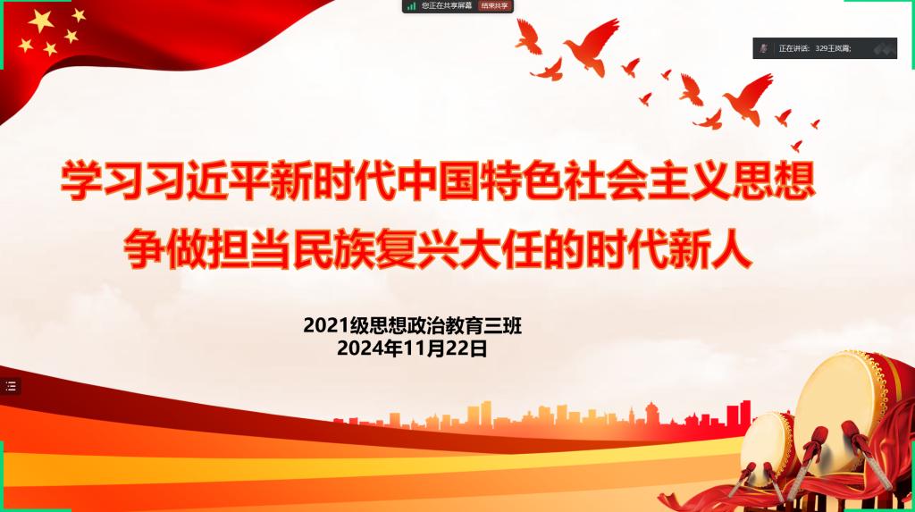 11月22日下午,ok138cn太阳集团5292021级思想政治教育三班在线上召开“学习习近平新时代中国特色社会主义思想,争做担当民族复兴大任的时代新人”主题团课。ok138cn太阳集团5292021级思想政治教育三班全体团员参与此次会议。会议由团支书王岚霄主持。